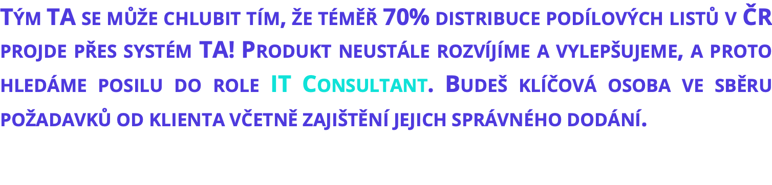 - Projektem je dlouhodobý produktový vývoj v oblasti distribuce podílových listů. Vyvíjíme nové funkcionality (70%) a zajišťujeme údržbu (30%). Každý rok máme v TAčku 4 velké releasy.